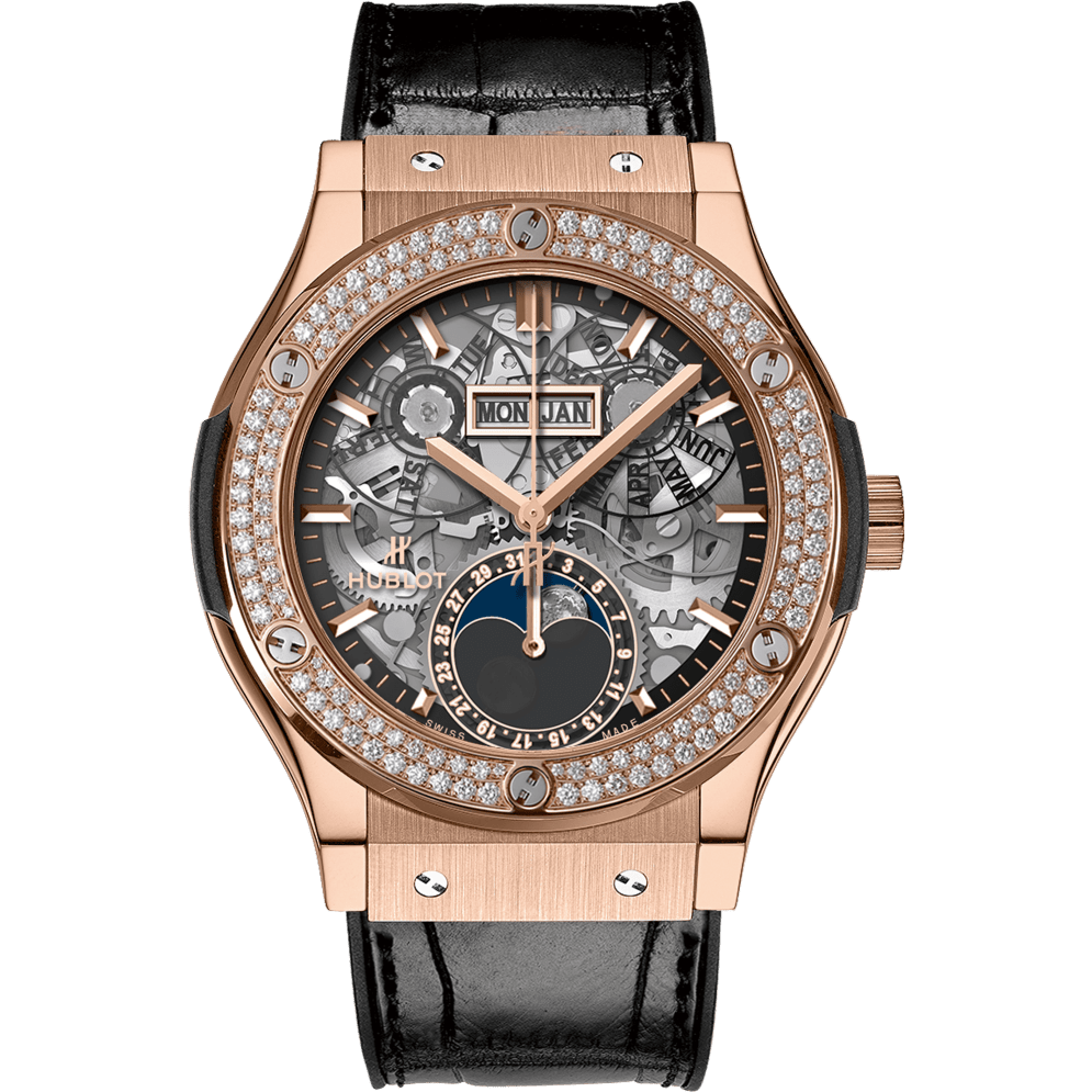 Thuộc dòng Classic Fushion có thể nói, đây là một trong những chiếc đồng hồ đáng giá của Hublot với thiết kế mặt đồng hồ bằng vàng hồng nguyên khối đặc trưng, nạm 2 vòng kim cương tương đương 138 viên tạo hiệu ứng tuyệt đẹp, giúp mặt đồng hồ luôn sáng. Điểm đặc biệt trong từng chiếc đồng hồ của Hublot chính là mặt đồng hồ luôn được cố định bởi 6 chiếc đinh hình chữ H - Hublot.