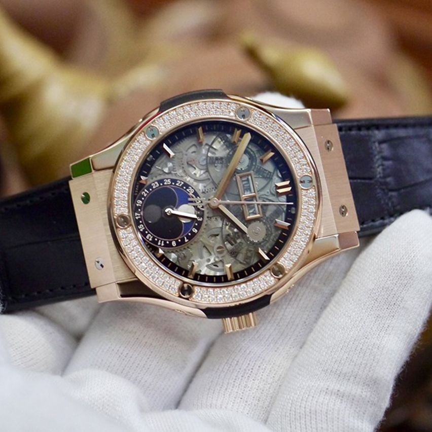 Là một trong những thương hiệu đồng hồ thể thao bậc nhất về sự xa hoa, độc đáo, Hublot qua bao nhiêu năm vẫn luôn khẳng định vị thế của mình trong làng thời trang thượng lưu. Từng chiếc đồng hồ phiên bản giới hạn được thiết kế tỉ mỉ, tinh xảo trước khi ra mắt để mỗi lần xuất hiện thường để lại ấn tượng lâu dài. Vài năm trở lại đấy, chiếc đồng hồ Hublot Classic Fusion Aerofusion Moonphase King Gold Diamonds được trình làng với mặt đồng hồ Moonphase độc đáo, mới lạ như tên của chiếc đồng hồ đó.