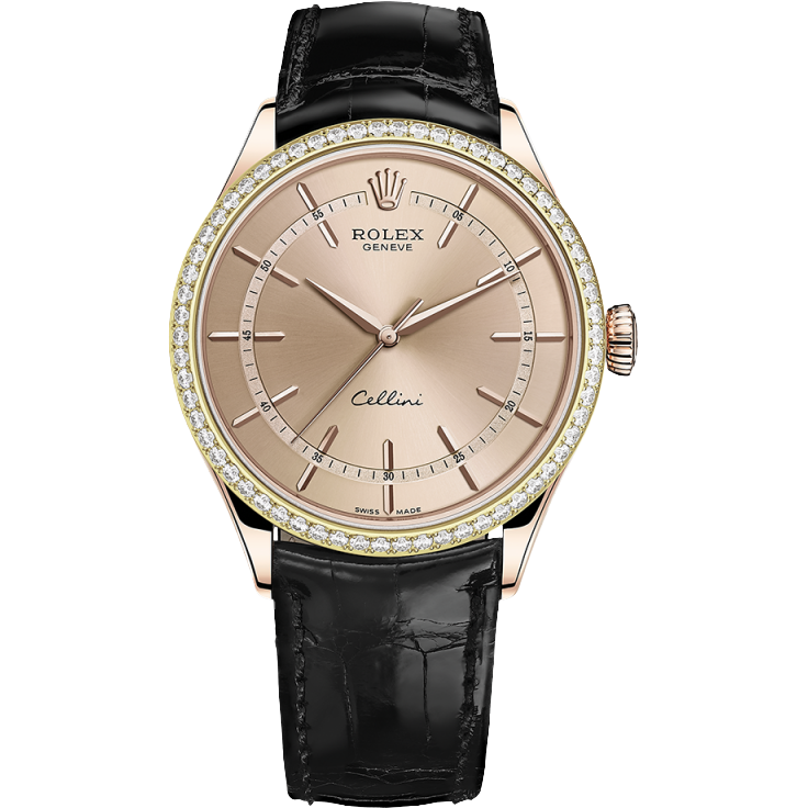 Theo phong cách truyền thống tinh khiết nhất, phiên bản Cellini Time được đánh dấu dây đeo da cá sấu khâu với quy mô lớn. Khóa 18 ct vàng phù hợp với vàng của các loại vỏ đồng hồ.