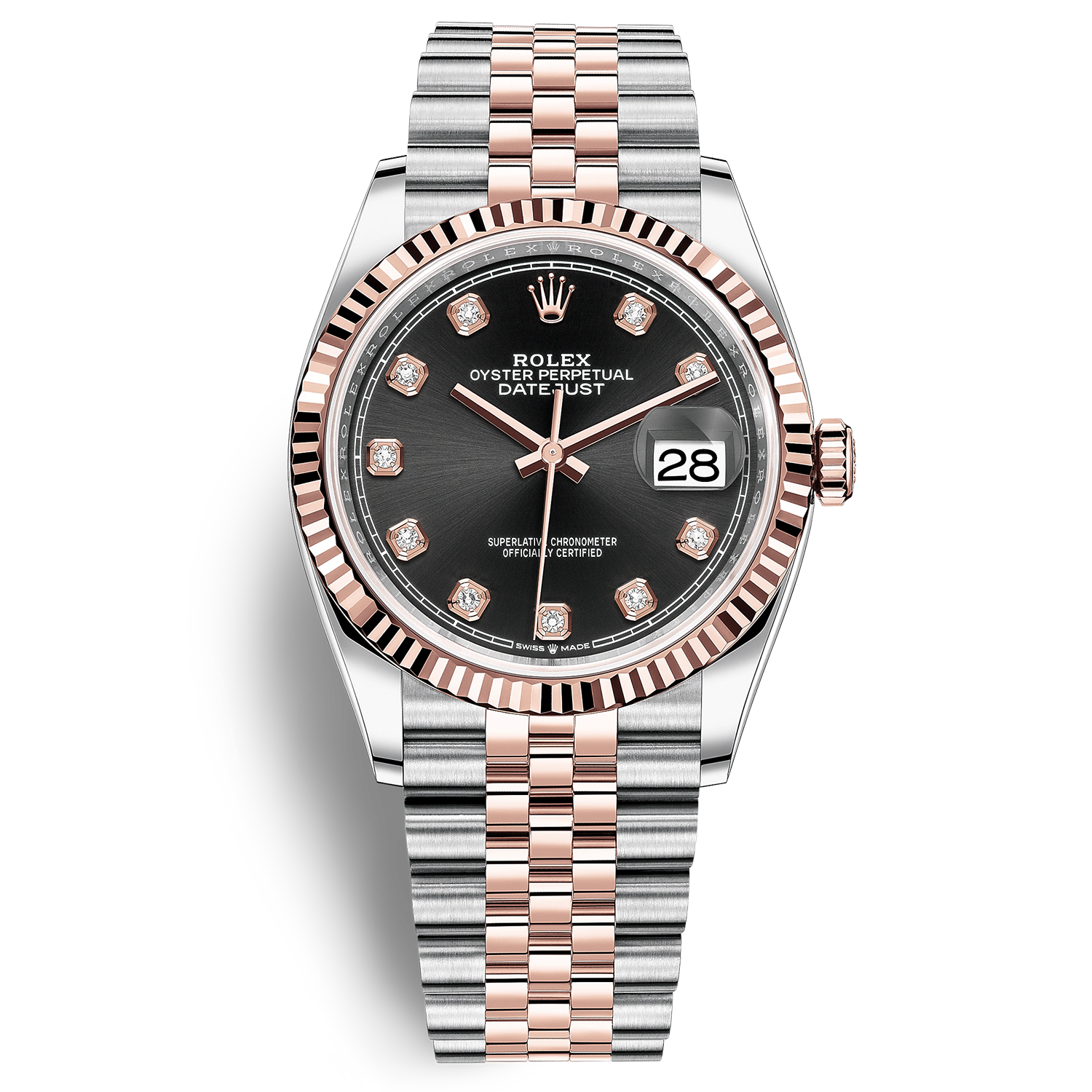 Mặt đồng hồ được chau chuốt với tấm nền đen bí ẩn tạo ra hiệu ứng thị giác cực kì đặc trưng. Nổi bật trên tấm nền đen, có thể thấy rõ các cọc số thiết kế bởi những viên kim cương cắt gọt chi tiết, vuông vắn. Chi tiết đặc biệt này tôn lên sự quyền lực cho mặt đồng hồ, tạo ra cảm giác xa xỉ và hào nhoáng. Cửa sổ “Datejust” chỉ ngày ở góc 3 giờ tinh tế, vừa vặn cùng thấu kính cyclops trứ danh ăn nhập hoàn hảo với vẻ đẹp tinh tế của toàn bộ mặt số. Bộ kim dài, đơn nét được làm từ Everose cho một độ nổi cân bằng trên tấm nền, với kích thước kim dài vuốt qua các cọc số. Tên hãng và logo vương miện góc 12 giờ khẳng định thương hiệu trứ danh đến từ Thụy Sĩ có tuổi đời hơn một thể kỉ.