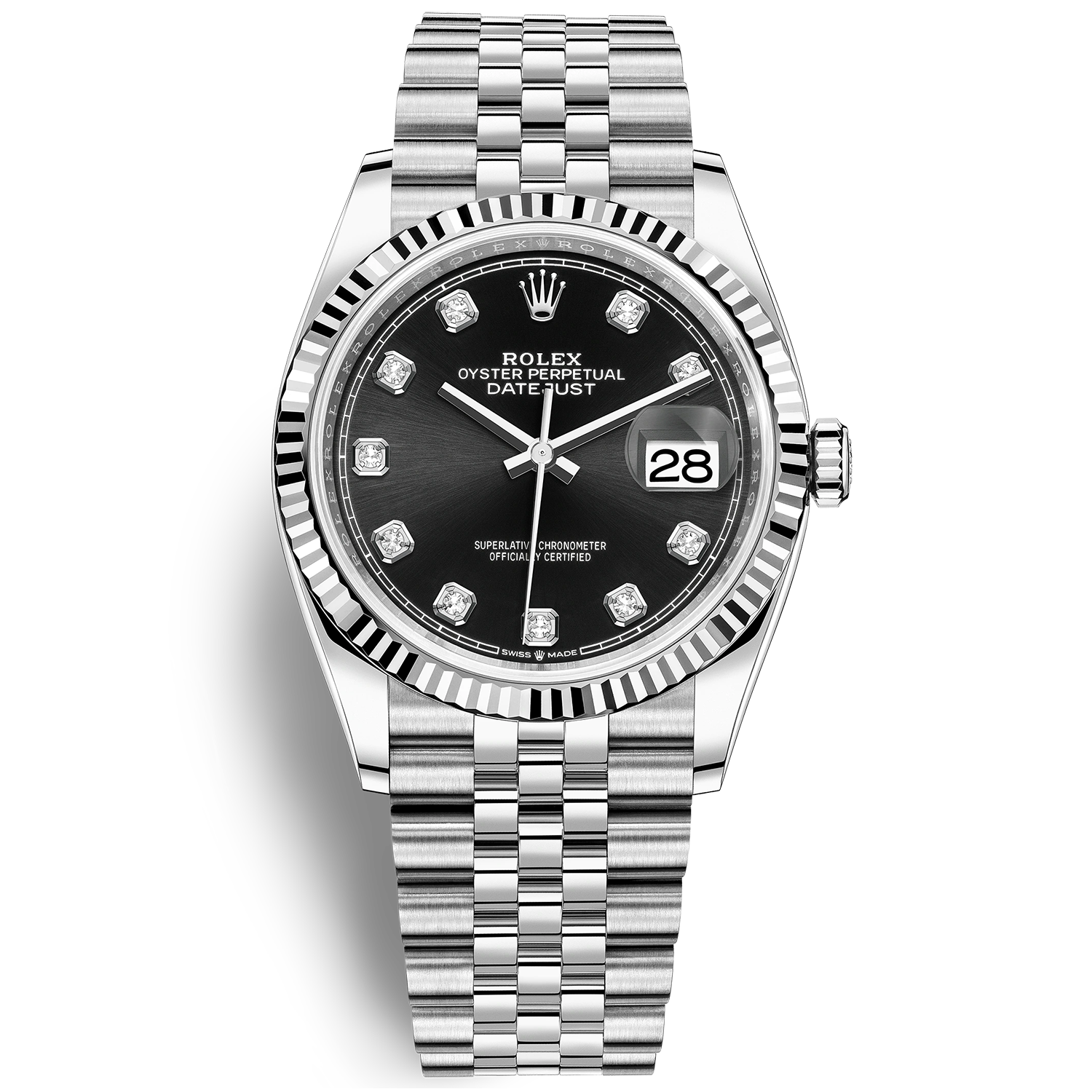 Khu vực có lẽ là thu hút công chúng thế giới nhất phải kể đến mặt đồng hồ. Sở hữu mặt số đen bí ẩn đầy ma mị, tấm nền của mặt đồng hồ ăn nhập hoàn hảo với màu sắc trắng tinh khiết ở phần vỏ và dây. Tông màu đối nghịch trắng đen tạo nên hiệu ứng cổ điển, đưa chủ nhân của chiếc đồng hồ về thời hoàng kim của dòng quý tộc Thụy Sĩ. Các cọc số làm từ kim cương được cắt tỉa vuông làm lộ ra vẻ cao quý cho mặt số. Cửa sổ chỉ ngày ở góc 3 giờ tinh tế, vừa vặn đúng tinh thần Datejust. Bộ kim mảnh, đơn nét kéo dài được làm từ thép Oyster tạo sự nổi bật rõ rệt trên tấm nền. Dây đeo Jubilee, mối nối 5 mảnh làm từ chất liệu Oyster là điểm nhấn cuối cùng tạo nên một tổng thể tinh khiết hoàn hảo của kiệt tác nghệ thuật xứng tầm hoàng gia.