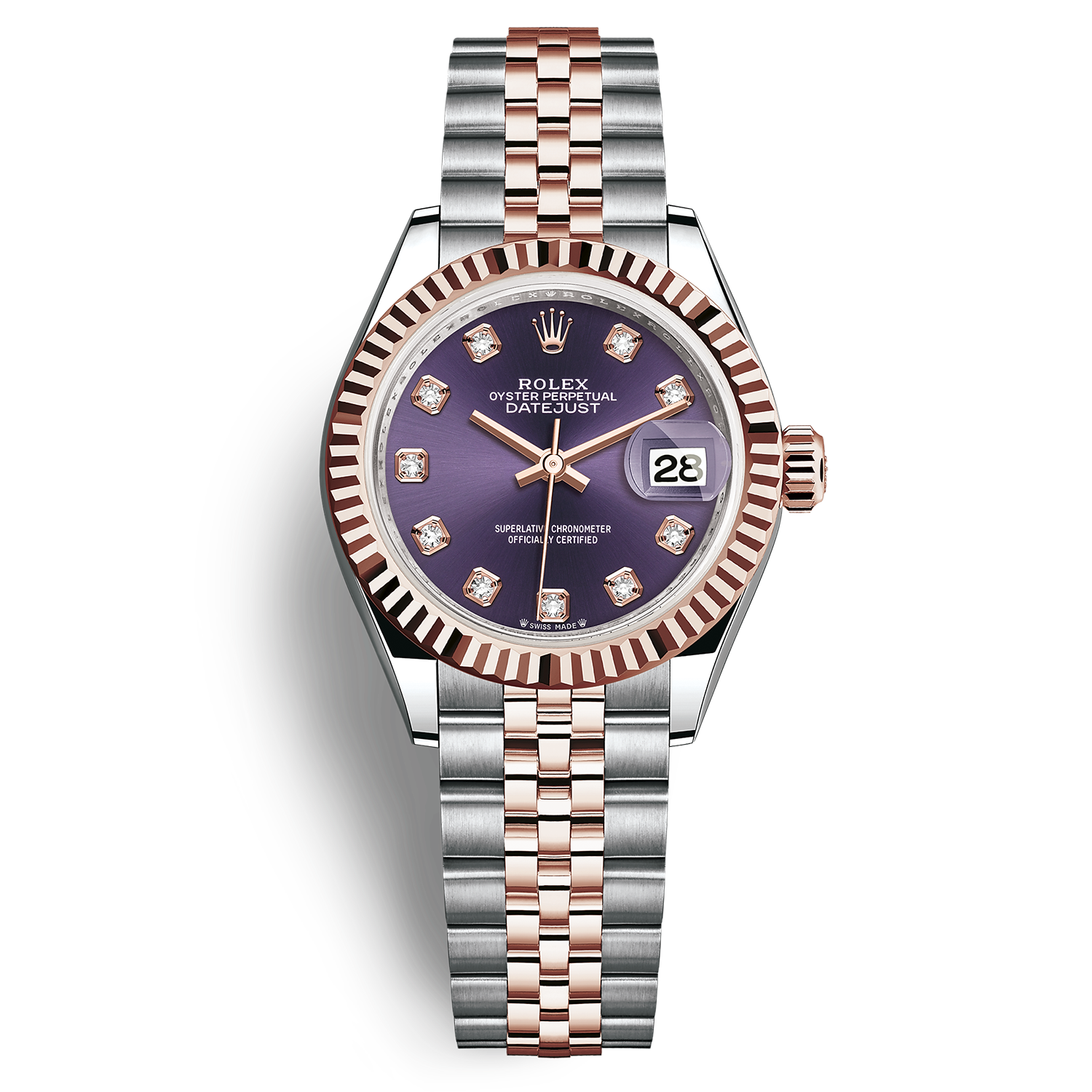 Phần mặt số của Rolex Oyster Perpetual Lady-Datejust 28mm được coi là một kiệt tác với tấm nền màu tím than danh giá nổi bật. Màu tím than tạo nên hiệu ứng thị giác đặc biệt, khiến ta liên tưởng tới những bảo vật quý hiếm của giới thượng lưu. Mỗi cọc số là một viên đá quý cắt gọt theo dạng khối vuông, tôn nên tính sang trọng và quyền lực của mặt số nhỏ. Bộ kim mảnh làm từ Everose tỏa sáng trên tấm nền đẹp mê hồn được kéo dài, vuốt qua toàn bộ phần cọc số với khả năng hiển thị chính xác gần như tuyệt đối. Những chi tiết còn lại như cửa sổ ngày góc 3 giờ logo Rolex nằm vừa vặn ở góc 12 giờ thể hiện đúng tinh thần tối giản đặc trưng của cái tên “Datejust”. Có thể thấy, mặt dù sở hữu kích thước mặt nhỏ cùng phong cách thiết kế tối giản, chiếc đồng hồ vẫn giữ được giá trị cao quý của nó bởi tính quý tộc mà nó toát ra. Bộ dây đeo Jubilee, mối nối 5 mảnh với chất liệu Rolesor cùng hai dải màu bạc và một dải vàng hồng, khóa vặn gập ẩn Crownclasp mang đến sự cân bằng hoàn hảo cho ngoại hình chiếc đồng hồ.
