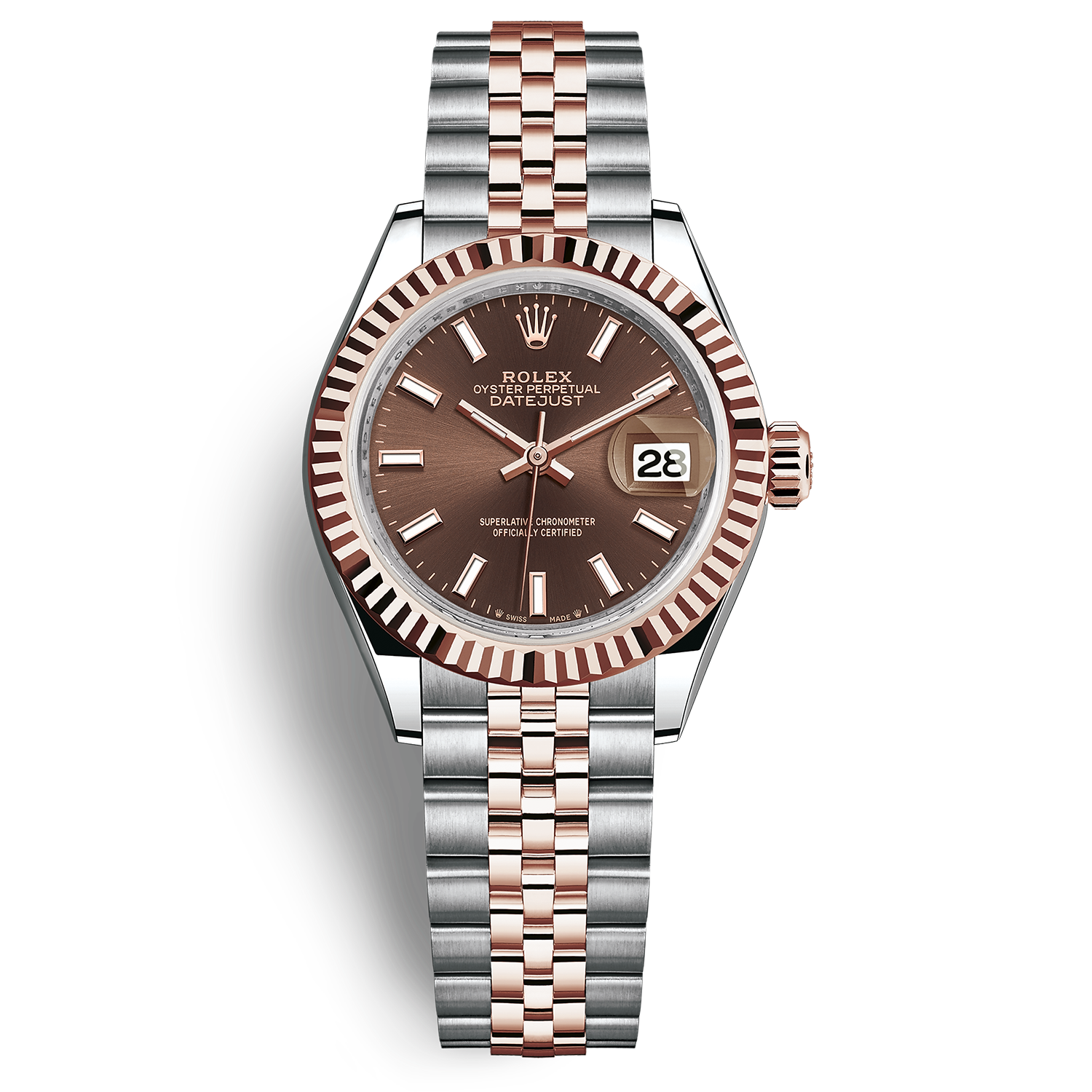 Rolex Oyster Perpetual Lady-Datejust 28mm sở hữu cái tên “Datejust” quen thuộc dùng để miêu tả phong cách tối giản thể hiện trên mặt đồng hồ. Phần mặt số với tông màu chocolate được bảo vệ bởi kính ngọc bích đắt đỏ, vật liệu có độ cứng lớn cùng khả năng chống lóa hiệu quả. Trong phiên bản này, các cọc số được làm theo dạng khối chữ nhật với lõi trắng. Cửa sổ chỉ ngày ở góc 3 giờ cũng logo Rolex góc 12 giờ tạo ra sự hoàn thiện đáng kinh ngạc cho một thiết bị có mặt số nhỏ. Bộ kim cũng được chế tác bởi vàng Everose tương tự như vành đồng hồ. Bộ dây đeo Jubilee, mối nối 5 mảnh với chất liệu Rolesor màu vàng tuyệt đẹp với 3 dải màu riêng biệt.