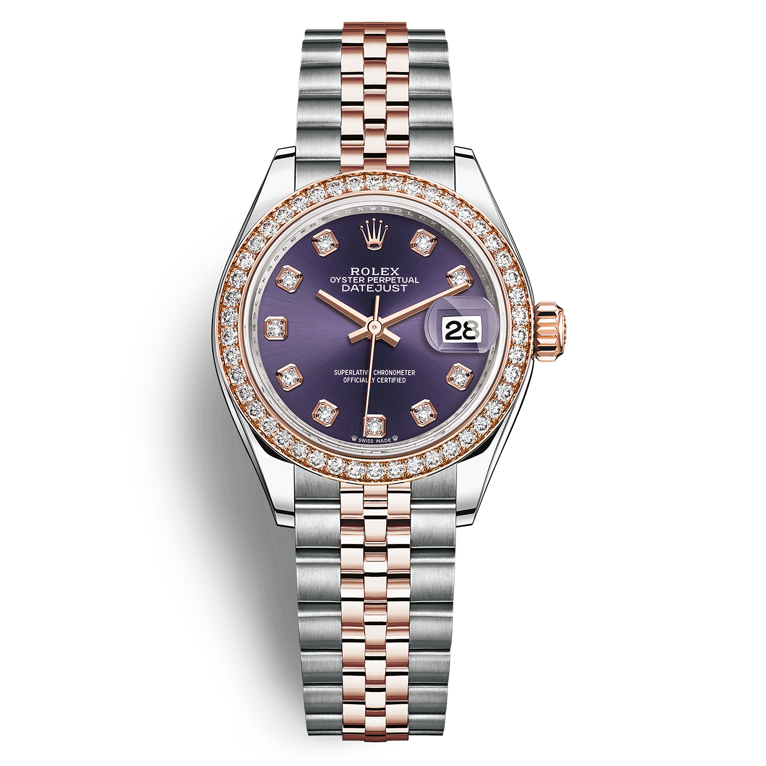 Rolex Oyster Perpetual Lady-Datejust 28mm phù hợp với các quý cô có cổ tay nhỏ đúng như tên gọi “Lady” mà hãng đặt cho thiết bị. Chiếc đồng hồ được thiết kế với phần vỏ đúc từ chất liệu đặc biệt – Rolesor, vật liệu pha trộn giữa vàng Everose và thép Oyster. Đây đều là hai vật liệu được Rolex nghiên cứu và thiết kế để sử dụng độc quyền cho các sản phẩm của mình. Các tính chất tuyệt vời chỉ có thể tìm thấy ở kim loại quý nay được chế tác đặc trưng cho cả phần vỏ và vành đồng hồ tuyệt đẹp. Điểm đặc biệt nhất của vành đồng hồ là chúng được nạm kim cương tự nhiên, thứ tạo nên mức giá đắt đỏ cùng vẻ đẹp khiến chiếc đồng hồ sánh ngang với một kiệt tác nghệ thuật.