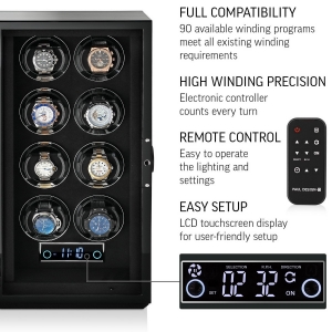 Bộ đổi nguồn AC đi kèm (100-240V, 50-60Hz).Tất cả các rôto dừng ở vị trí 12 giờ sau mỗi chu kỳ lên dây để hiển thị tốt hơn bộ sưu tập đồng hồ của bạn.Các rôto của bộ đánh gió đồng hồ có thể được lập trình độc lập. Bạn có thể đặt một chương trình riêng cho từng rôto tùy thuộc vào kiểu đồng hồ mà bạn đặt vào đó.Có ba hướng quay: chiều kim đồng hồ, ngược chiều kim đồng hồ và hai hướng (hỗn hợp). Ở chế độ hỗn hợp, rôto quay luân phiên theo chiều kim đồng hồ và ngược chiều kim đồng hồ.Giá đỡ đồng hồ kính thiên văn có lò xo có thể được sử dụng cho đồng hồ với bất kỳ kích thước dây đeo và vòng tay nào. Giá đỡ tự động điều chỉnh phù hợp với mọi kích thước cổ tay từ 6 "đến 8,5" (15,5 đến 21,5 cm). Lớp phủ nhung mềm bảo vệ đồng hồ và vòng tay của bạn không bị trầy xước.Bộ lên dây đồng hồ đi kèm với khóa vân tay điện tử. Có thể lưu đến 5 dấu vân tay.Bộ điều khiển điện tử đếm từng vòng quay của đồng hồ để duy trì độ chính xác lên dây cót.Tính năng sản phẩm: