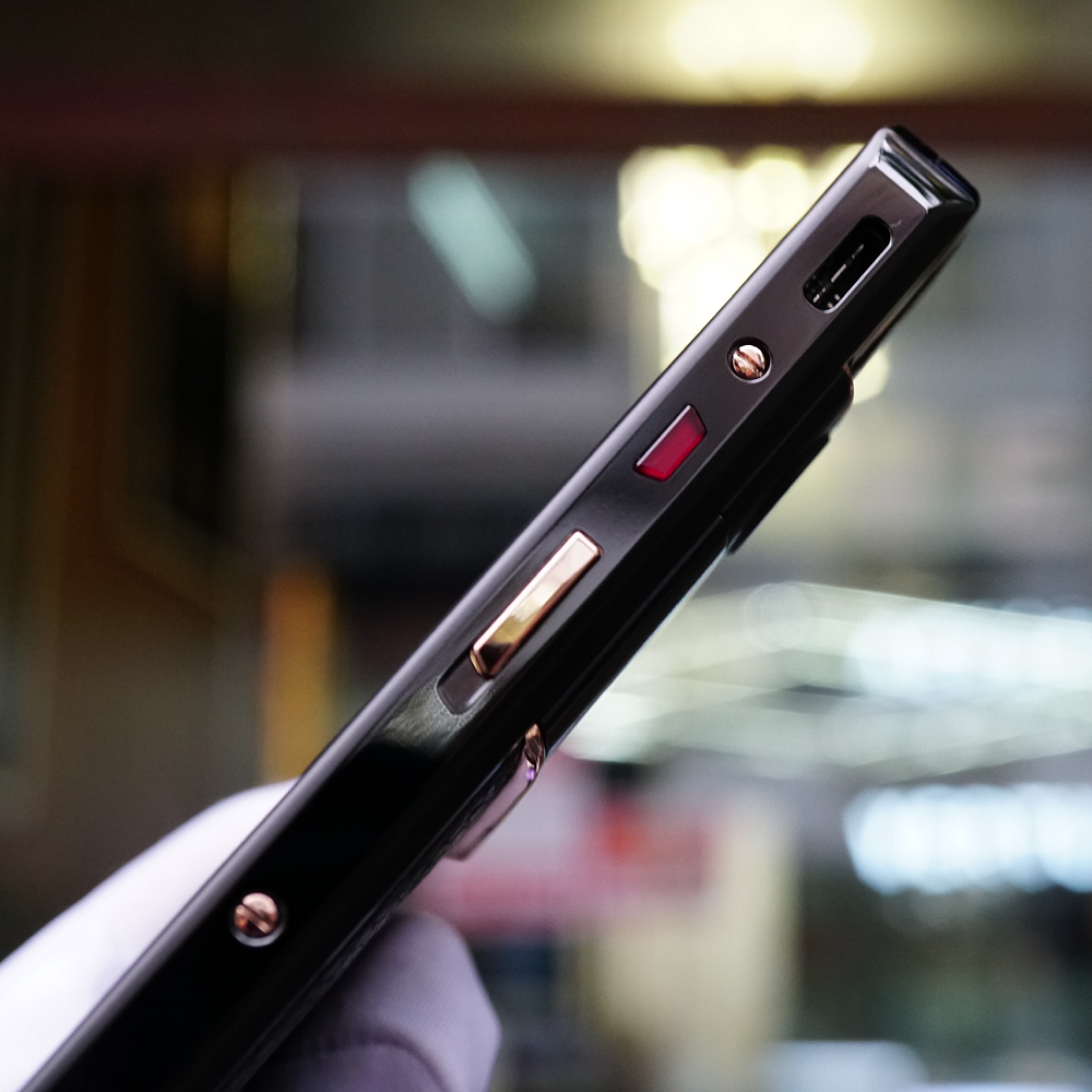 Phần khung của VERTU ASTER P Gold được thiết kế bởi chất liệu Titan cấp 5. Titanium là chất liệu kim loại có độ bền cực lớn nhưng trọng lượng nhẹ hơn thép đáng kể. Vật liệu này được sử dụng phổ biến trong các thiết bị quân sự và không gian như tàu vũ trụ, tàu ngầm, máy bay,… Trong phiên bản này, VERTU ASTER P Gold được điểm xuyết các chi tiết bằng vàng 18k lộng lẫy tinh tế ở phần loa thoại, phần dưới màn hình và phần nắp lưng. Ngoài ra, phần viền của thiết bị được thiết kế bo cong góc uyển chuyển cùng các nút bấm chức năng. Nút bấm ruby nguyên chất làm nên tên tuổi của dòng Aster P cũng xuất hiện ở phần cạnh phải thiết bị.